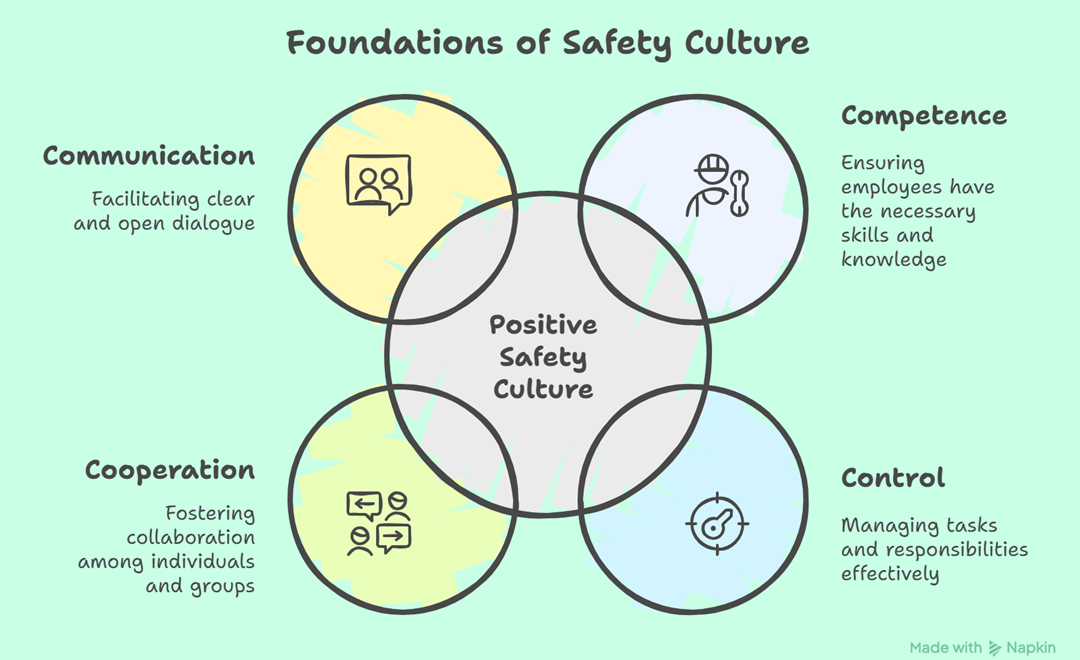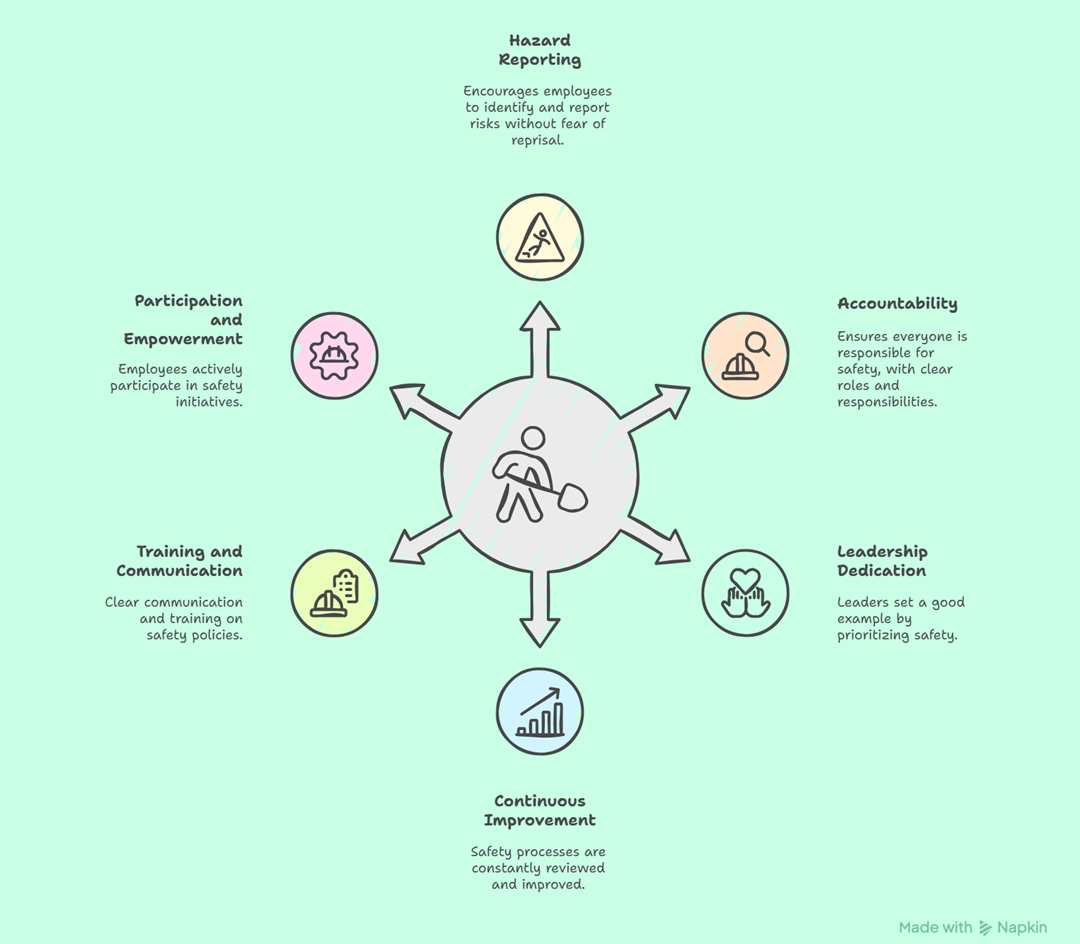 - Accountability: From the site manager to the newest worker, everyone bears responsibility for safety in a safety culture. Accountability is upheld, and roles and responsibilities are clearly defined for safety.