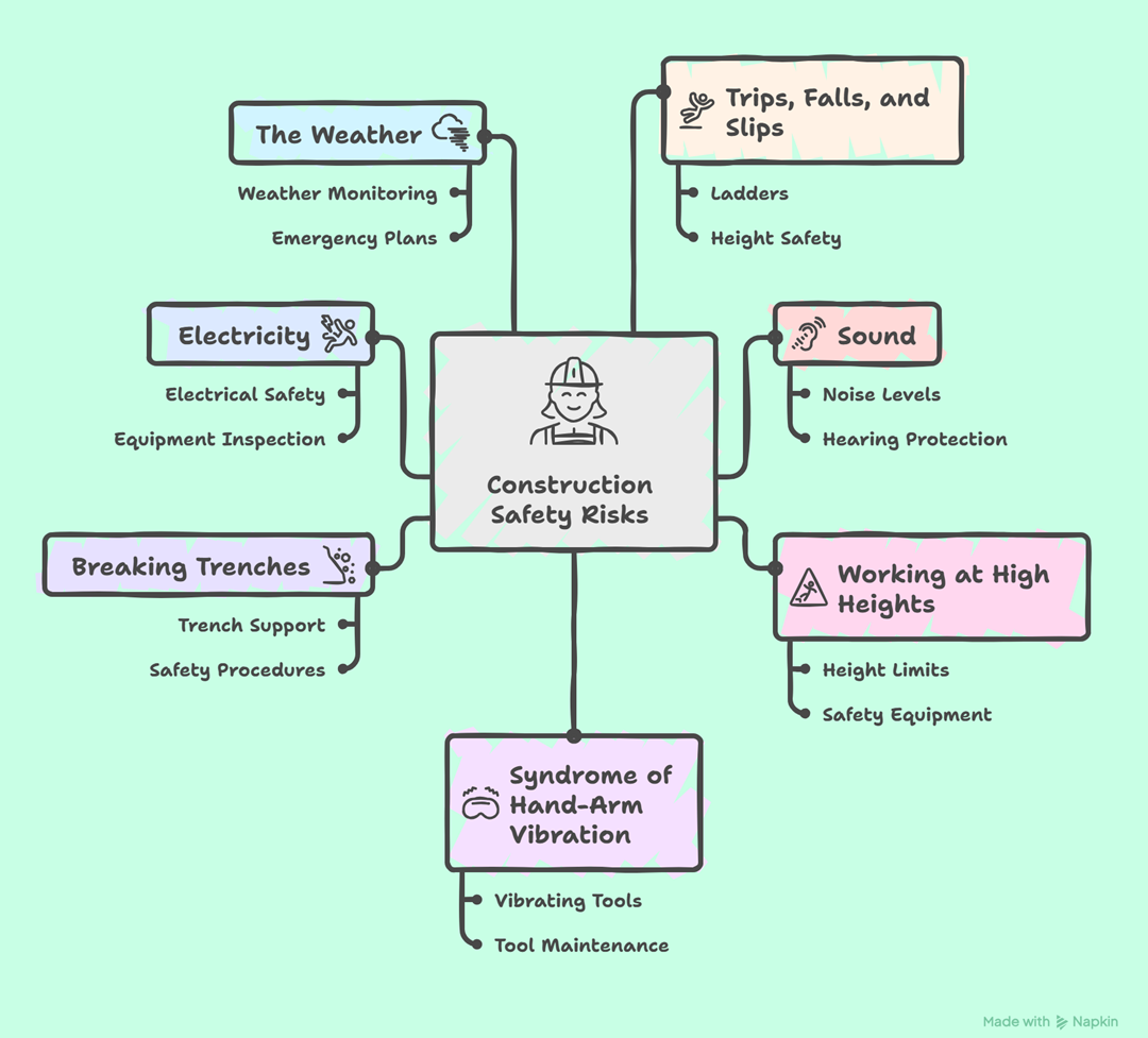 Operating large machinery, working at heights, and dealing with erratic conditions like bad weather or unstable ground are all common tasks in construction.